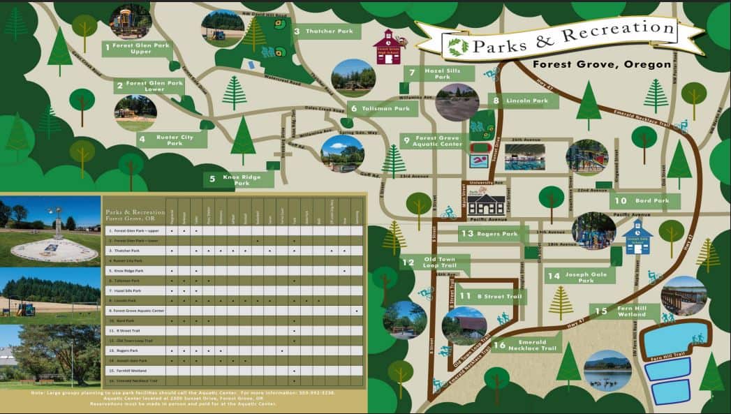 El sendero Emerald Necklace es la visión de Forest Grove de una vía verde que rodee la ciudad. Cuando esté terminado, el sendero multiusos pasará por Gales Creek, el distrito histórico de Forest Grove, la Universidad Pacific, Lincoln Park y Fernhill. Los humedales de Fernhill son uno de los principales puntos de observación de aves del valle del Tualatin.