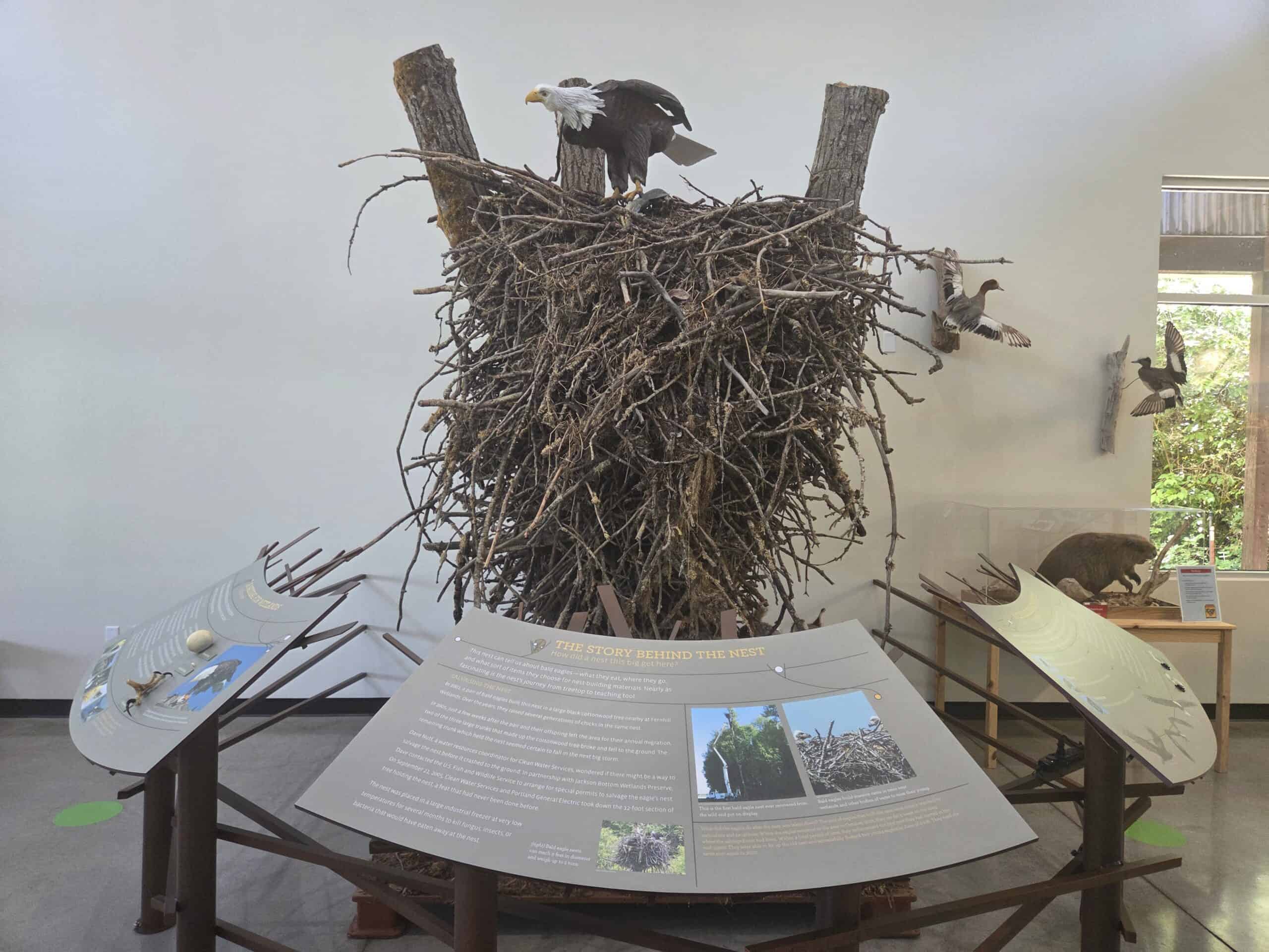 Bald Eagles are commonly seen along the Tualatin River particularly in the less populated sections. Bald Eagles often nest in the Jackson Bottom Wetlands and Tualatin River National Wildlife Refuge and surrounding areas. The Jackson Bottom Wetlands Nature Center has, what is reputed, to be the world’s largest Bald Eagle nest on display. It was in a tree that fell over and then moved to the Nature Center.