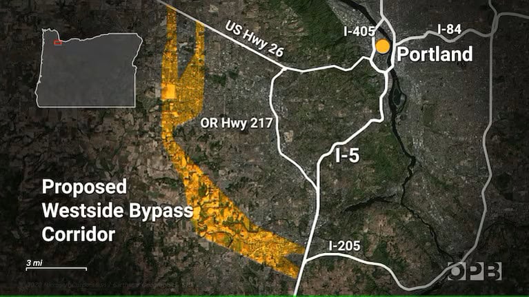 An equivalent Westside Bypass on the west side of Portland, Oregon was proposed in the late 1980s. The Westside Bypass was proposed to run between I-5 in Tualatin, Oregon and the Sunset Highway (US 26) in Hillsboro. However, strong opposition from a wide range of communities and organizations caused the project to be cancelled in 1997. This opposition included a group of citizens who were concerned about the large impact the freeway cooridor would have on the Tualatin River watershed. This group ultimately formed the Tualatin Riverkeepers in 1992.