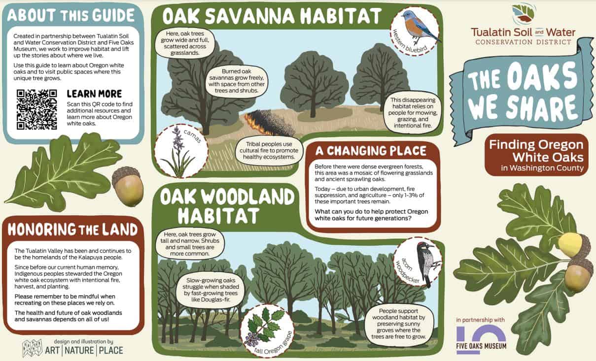 The Quamash Prairie Natural Area is named after the plant Camassia Quamash more generally known as Common Camas. Metro acquired Quamash Prairie in two phases: 115 acres in 1996 and 45 acres in 2006. Since the acquisition, Metro has collaborated with the Grand Ronde to transform the former grazing land back to a healthy prairie. In 2019, the Grand Ronde conducted a controlled burn at the site to help maintain the site for White Oaks and Common Camas. The White Oak acorns and camas bulbs are both valued First Foods. The prescribed burn mimics the Atfalati’s use of fire to maintain the Tualatin River valley oak savannas.