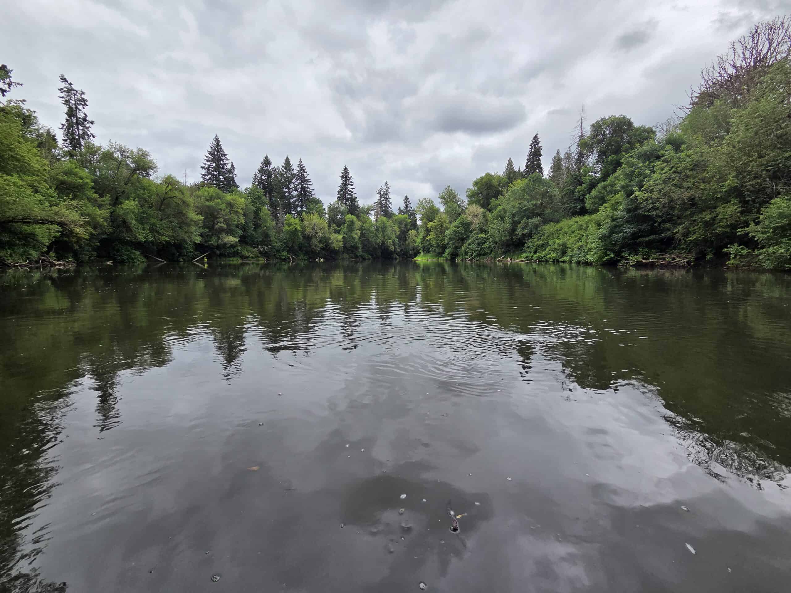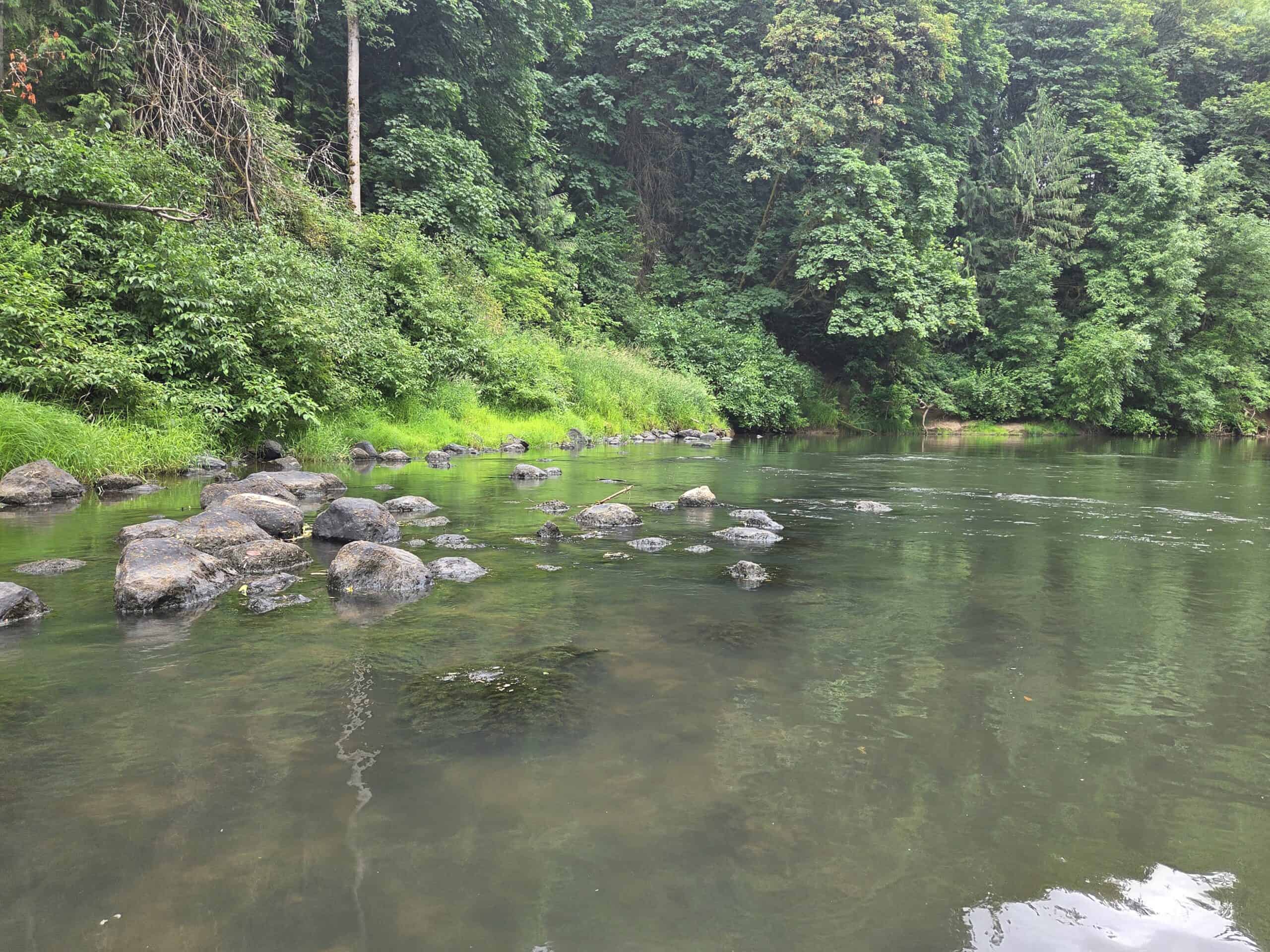 Pools like this river pool make great fish habitat providing both cover and shelter. The surrounding vegetation helps keep the water cool for the Tualatin River fish which include Cutthroat, Rainbow and Steelhead Trout; Smallmouth Bass, Blue Gill, carp, crappies and sticklebacks. Threatened Steelhead Trout return to upper Tualatin River tributaries to spawn in the clear swift running streams.