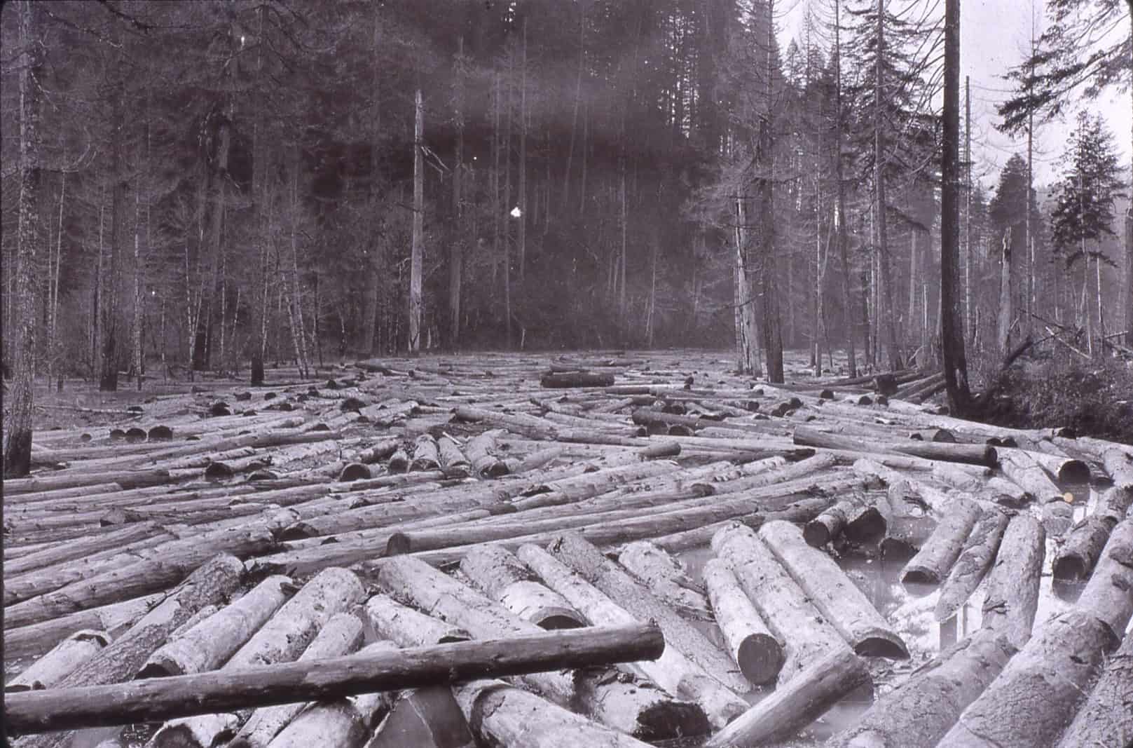 The exposed basalt layer seen at this point in the river is due to activity associated with the logging industry. When log drives became the most popular means of getting timber to the mills, stream flow had to be constant with no obstructions. “Splash dams” were constructed across sections of the river, storing water and logs behind them. When the spillway was opened, large quantities of water and logs were flowed downstream. Over time, this scoured the river beds down to the basalt layer destroying habitat and channel complexity.